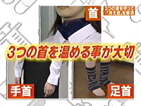 体の熱は胸元や首周りから発散される。襟付きの服で首周り、長袖で手首、ソックスなどで足首を温める。これらの3つの首を温めることが大切。