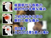 こめかみから目の周辺/ズキンズキン脈打つような痛み⇒片頭痛